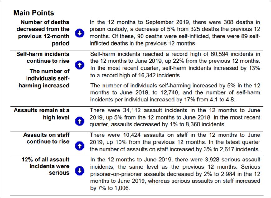 Despite the fact that figures have been worsening every quarter for the last five years, the new bulletin, which covers deaths in prison custody for the year to September 2019 and assaults and self-harm for the 12 months to June this year, once again shows unprecedented levels of self-harm and assaults.